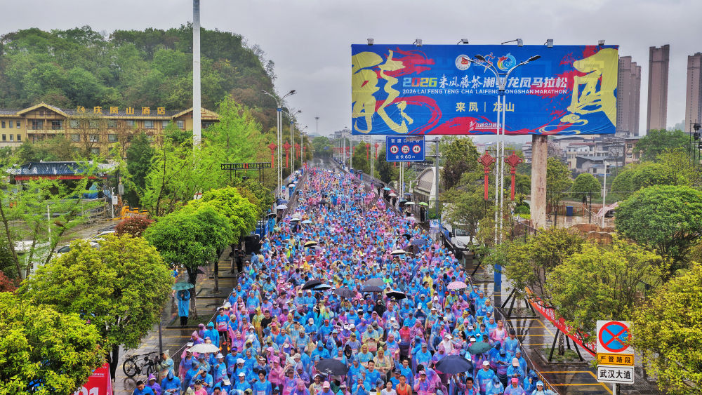 2026湘鄂龙凤马拉松4月11日在湖北恩施来凤县开赛,来自全国各地超万名跑者齐聚湖北来凤和湖南龙山,以一场跨省的奔跑,见证两地深厚情谊。